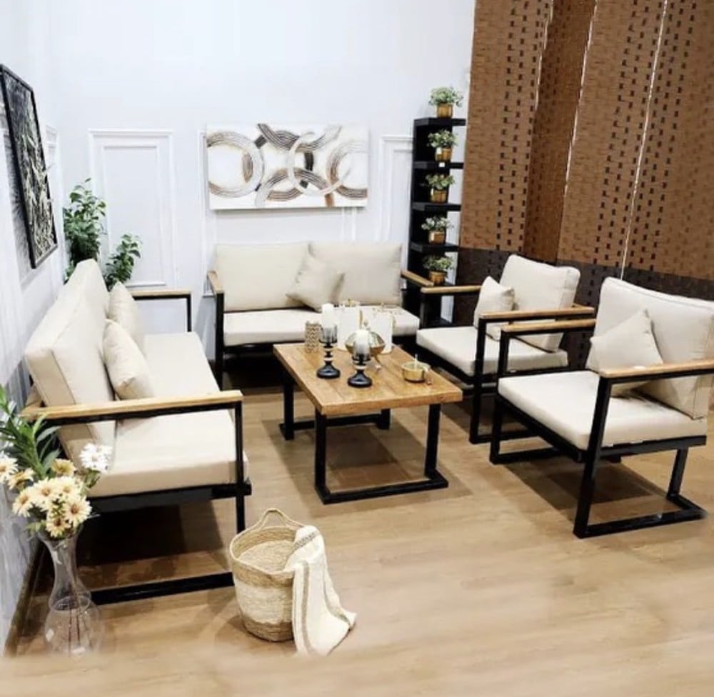 طقم حديد أسود ملبس بخشب يكفي 7-9 اشخاص، يحتوي على التالي:
